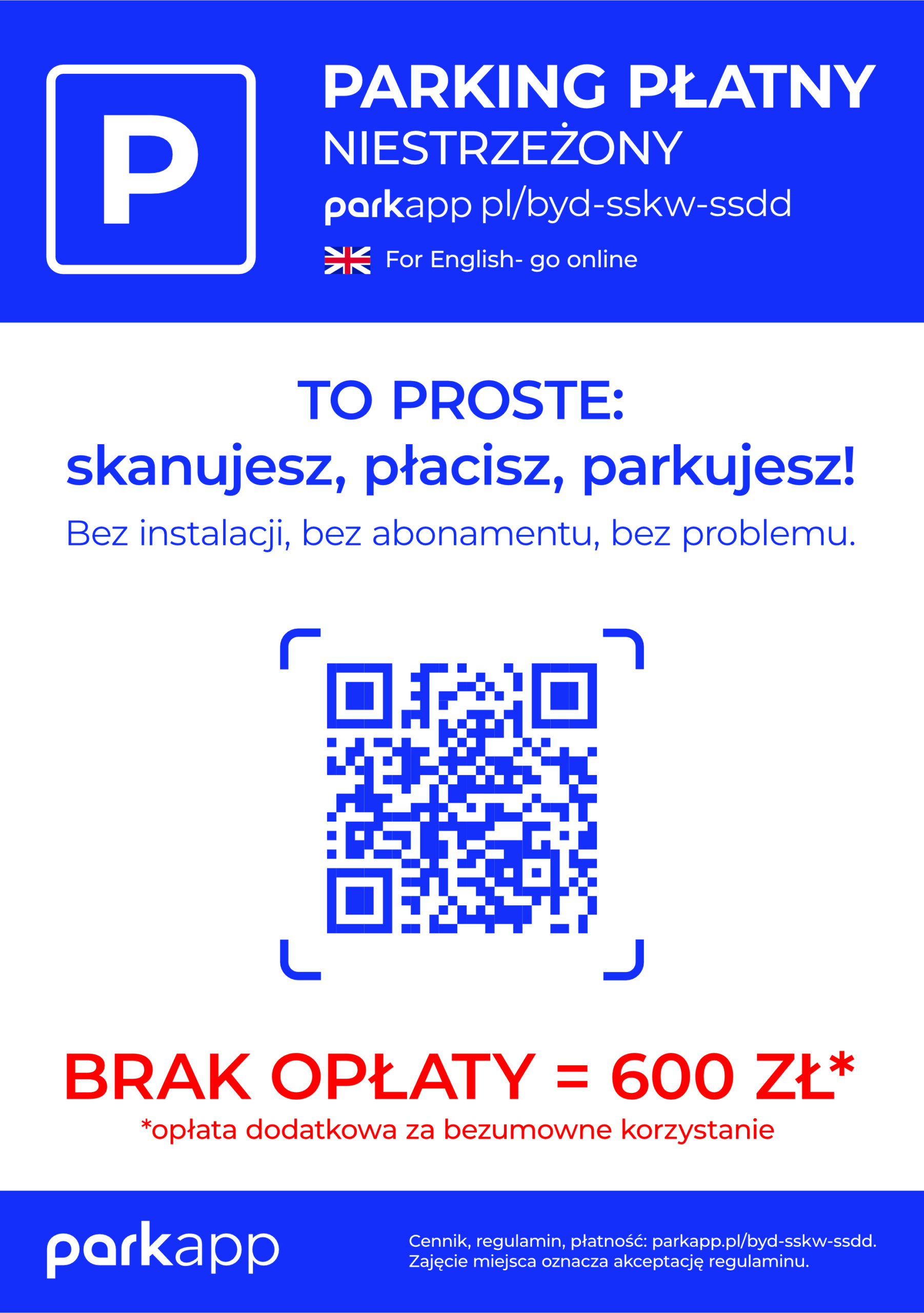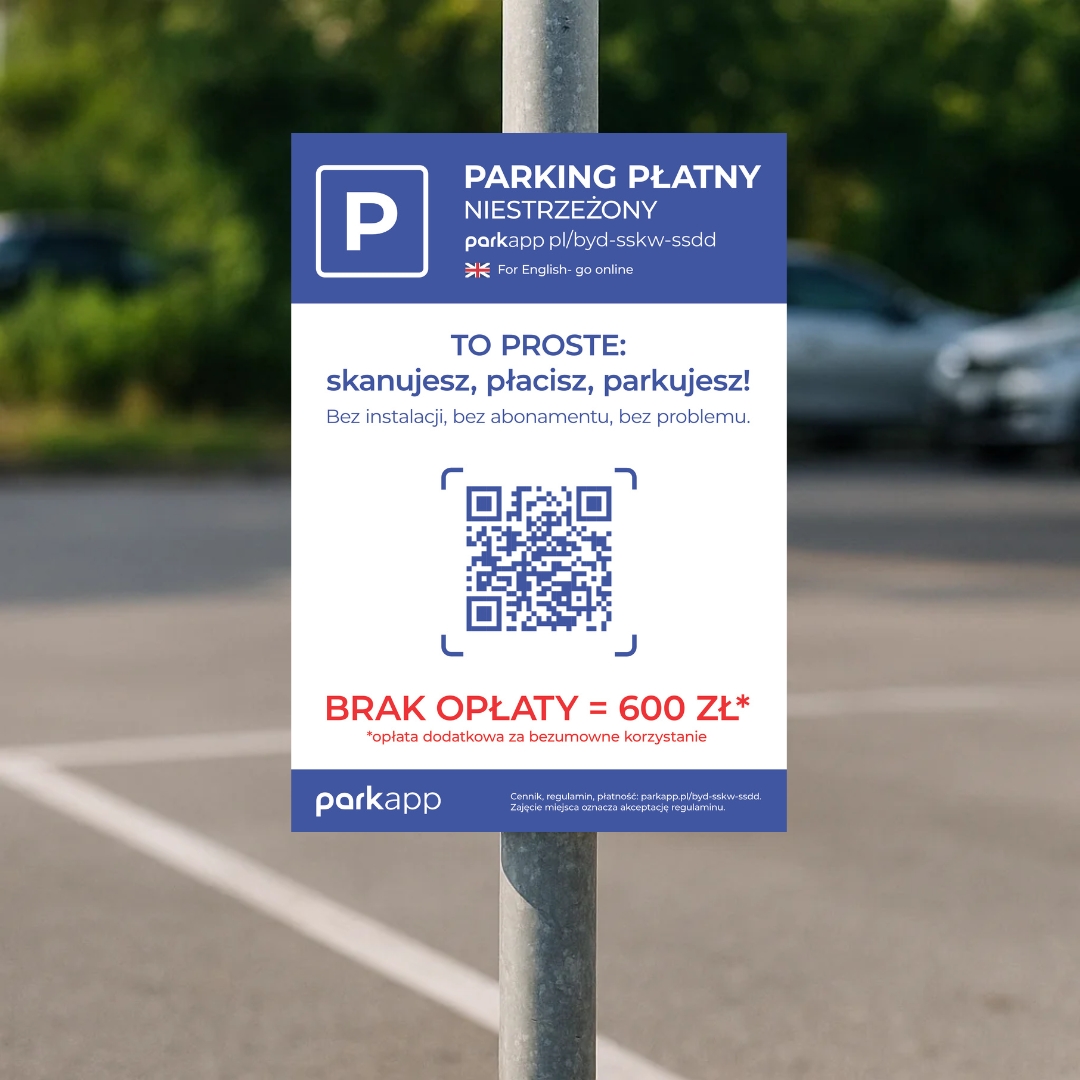 • Motyw 1: grafika informacyjna z ikoną „P” – czytelna, zgodna ze standardami oznakowania ParkApp